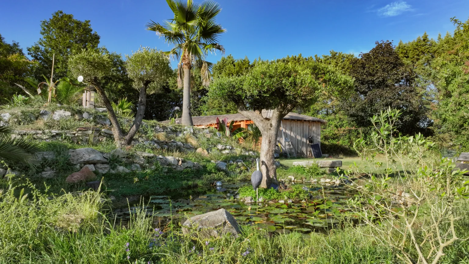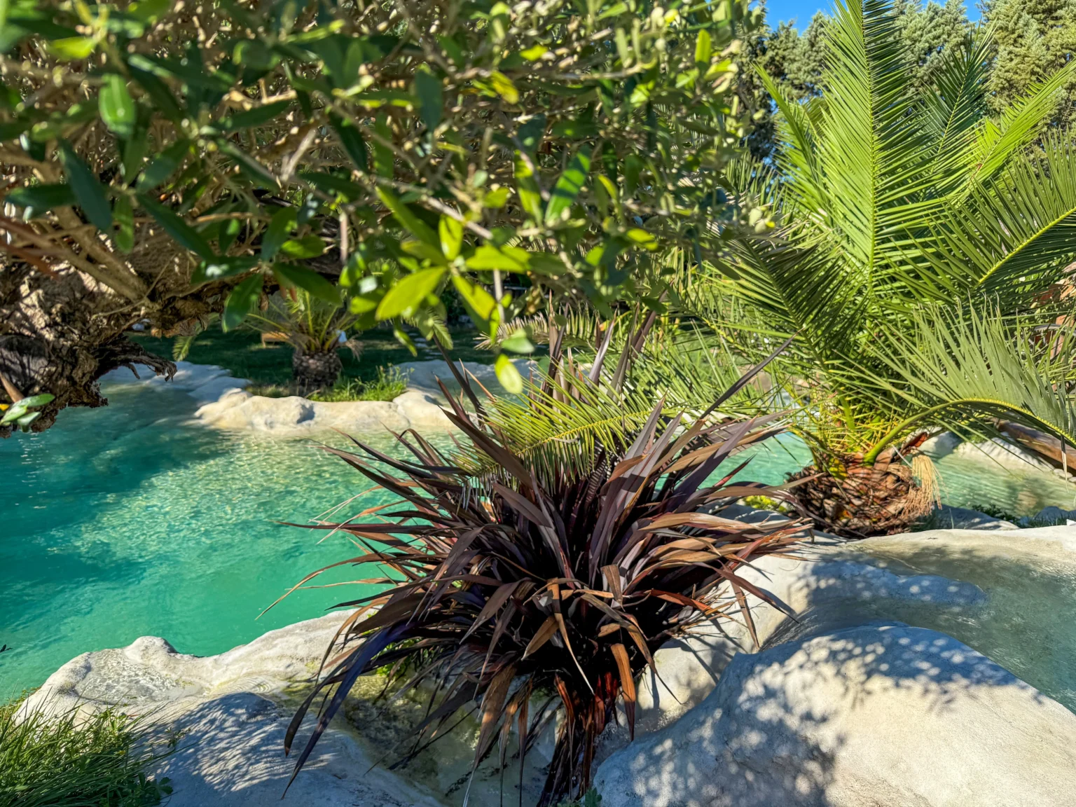 Ce lagon s’intègre naturellement entre une terrasse ombragée et un petit potager, entouré d’oliviers et de murs en pierres sèches.